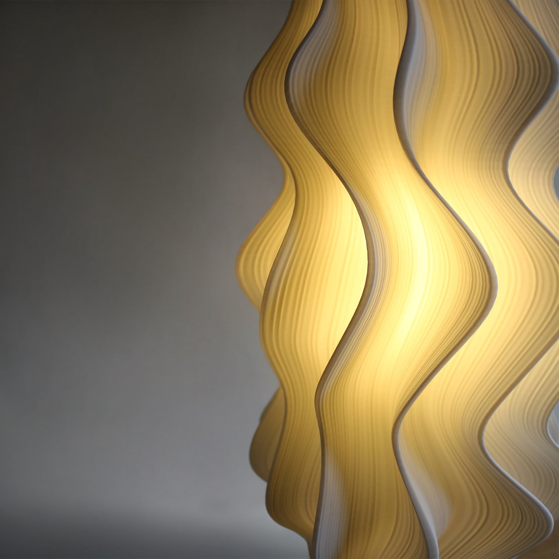 This White Iris Floor Lamp features very small black surface dots caused by minor calibration variation during the printing process. These marks are subtle and do not affect the overall aesthetic, form, or glow of the piece. The last two images show these surface dots for reference.
